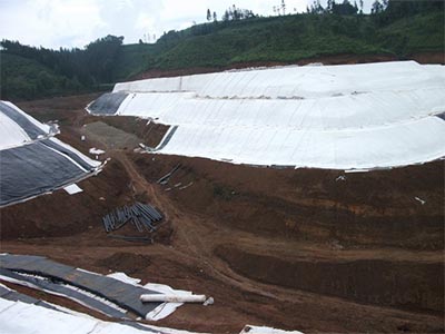 固體廢棄物垃圾填埋一般是利用山坳、開挖過的礦山等進行填埋防滲。填埋場的防滲層上面都是要填埋成千上萬噸的垃圾,所以一般采用1.5mm以上厚度的防滲膜,幅寬也應大于6米,減少焊接縫。因為實踐證明,填埋場的滲漏70%出現在焊接縫。坡面可采用糙面土工膜,增加摩擦系數,使可用容積達到大化。