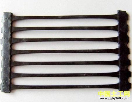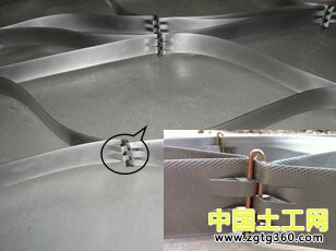 高強鋼絲(或其他纖維)經特殊處理與(PE)或(PP)并添加其他助劑,通過擠出使之成為復合型高強抗拉條帶。條帶經縱、橫按一定間距編制或夾合排列,采用焊接其交接點而成的平面網狀結構土工格柵。