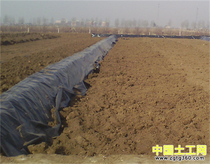 3、從沒有堆土的一面繼續取土20公分置于已經鋪設的專用防滲膜面上,然后平底鋪膜,就這樣一直挖土填土到規劃的位置。膜邊重疊要求在10-15公分,由技術人員用焊接方式處理。
