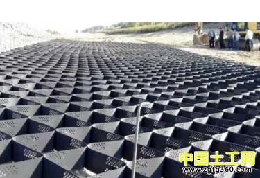以上所舉的這些例證多是利用土工格室提高承載能力。其實,土工格室的另一個重要作用是控制沖蝕,而且在國外使用土工格室控制沖蝕的應用量絲毫不亞于承載應用。應用多的有護坡、堤壩、擋土墻、防波堤岸等等。它的原理就是增加流動能力,減少毛溝侵蝕,防止水壓積聚、消除集中沖蝕。蜂窩限制結構可以固定填充材料,限制作用于其上的水壓,從而改善了流動能力。蜂窩壁使正常的排水可以進行,但卻控制了窩內的流動速度。如同千百個微型堤壩,將集中水流分散成均勻、舒緩的薄層水流。