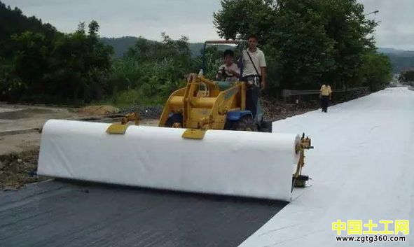 可將瀝青浸漬土工布改成噴灑瀝青結合油,將土工布牢固地滾壓在上面,再噴一薄層瀝青增加對面層的粘合度,提高防水性。若使用攤鋪機鋪設瀝青混凝土面層時,可不噴面層瀝青,只在底面加大瀝青用量,控制在1000g/m2左右。經碾壓后,瀝青會通過其孔隙透過土工布,反滲到面層。形成一道密封的防水層,同時還起到加筋作用。